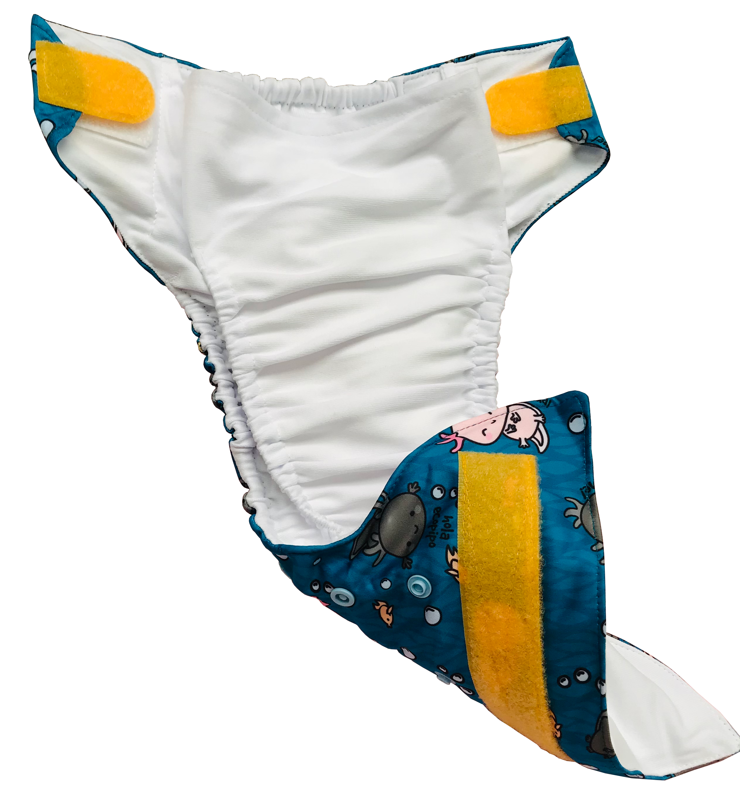 Cada pañal trae unos broches frontales para ajustarlo a las diferentes tallas (tiro) y se ajustan a la cintura por medio de velcro , incluso puede colocarse una bandita sobre otra.